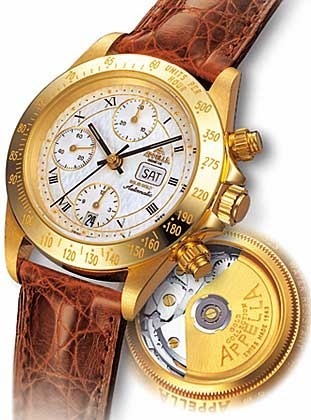 Appella представила новую модель часов – Gold Automatic Chronograph. Автоматический механизм калибра 7750 с 25 камнями и частотой полуколебаний 28.800 в час. Сапфировое стекло, задняя крышка оснащена сапфировым смотровым окном. Часы оборудованы шкалой тахометра и хронометром на 60 секунд и 30 минут. На золотом роторе имеется гравировка фирмы производителя и название модели.